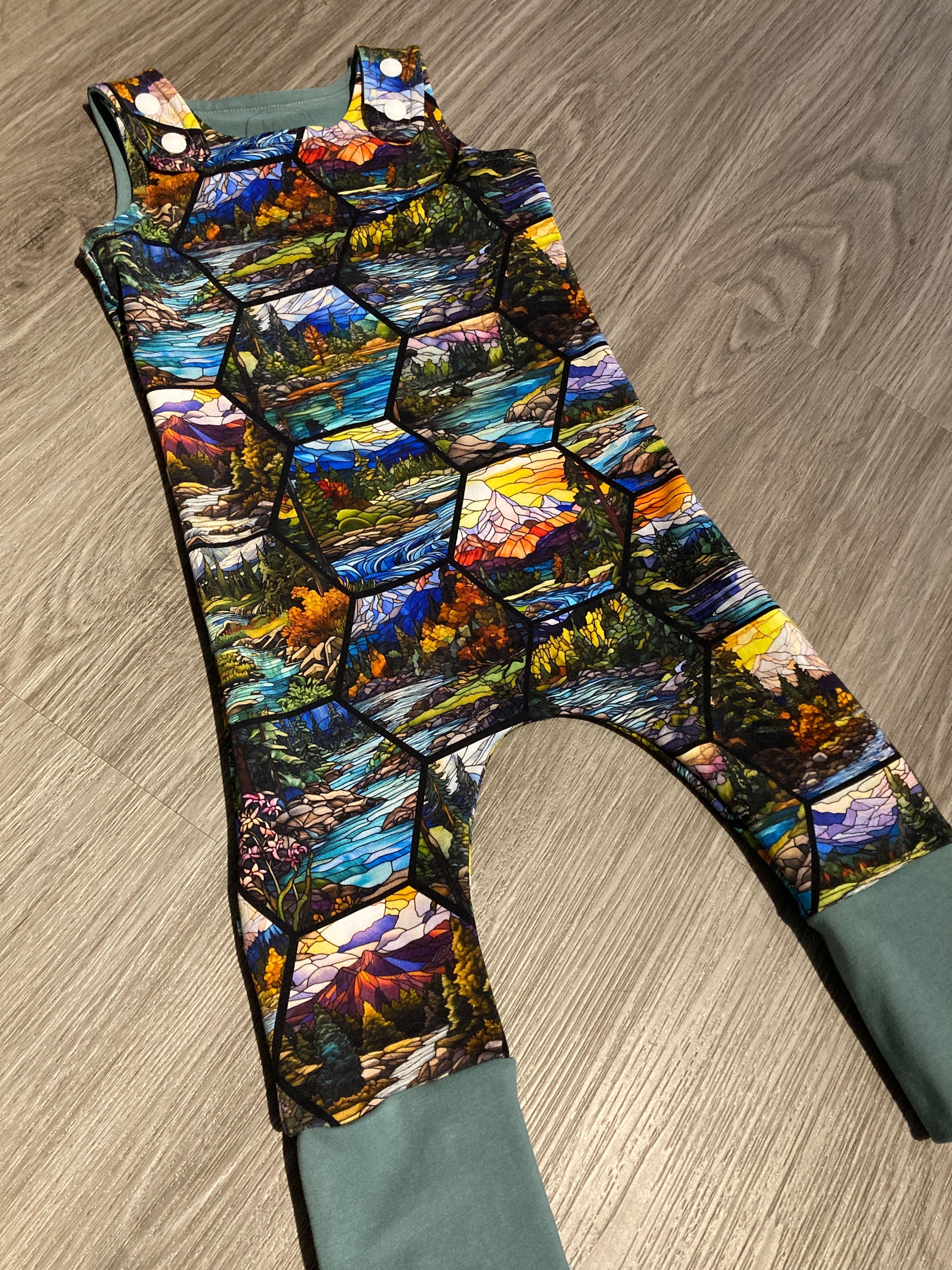 Our most popular item. Cotton jersey print with liner and cuffs in a turquoise cotton jersey. It adjusts with a hidden drawstring on the sides of the torso and features grow with me cuffs and adjustable shoulder snaps to give you a piece of clothing that lasts far longer than something purchased in store.